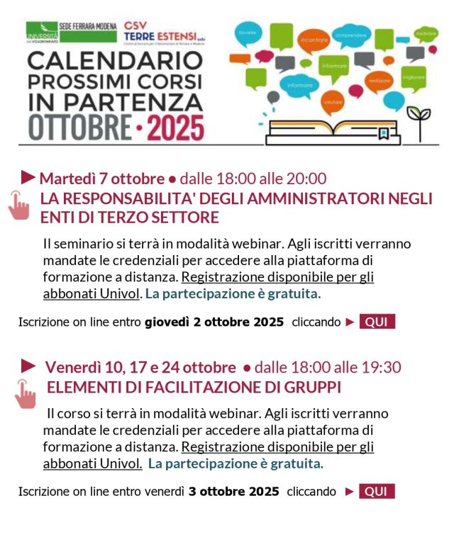 Sei un volontario/a di un ente del terzo settore ferrarese e modenese? Scopri i prossimi corsi in partenza e iscriviti on line!
