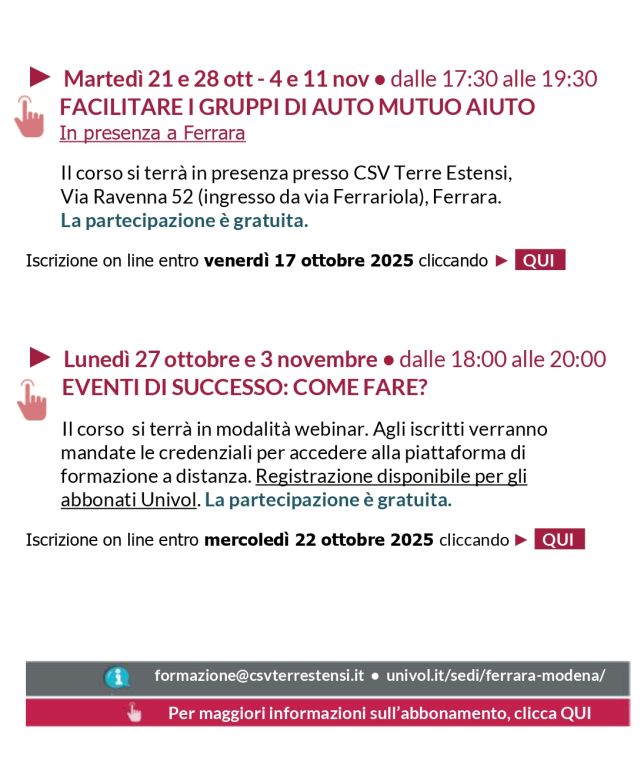 Il corso si terrà in presenza presso CSV Terre Estensi, Via Ravenna 52 (ingresso da via Ferrariola), Ferrara.